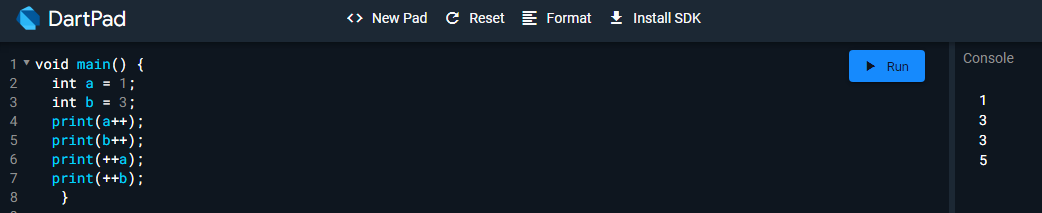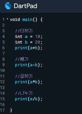우선 Dart pad에 접속하면 void main(){}을 적어줍니다. 이제는 기본입니다.